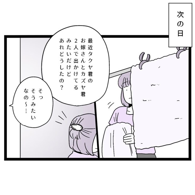 次の日。庭で洗濯物を干していると、ご近所さんと義母が話しているのが聞こえてきました。「最近タクヤ君のお嫁さんとカズヤ君2人で出かけてるみたいだけど、あれどうしたの?」と聞かれた義母は「そっ、そうみたいなの~・・」と平静を装って答えますが、