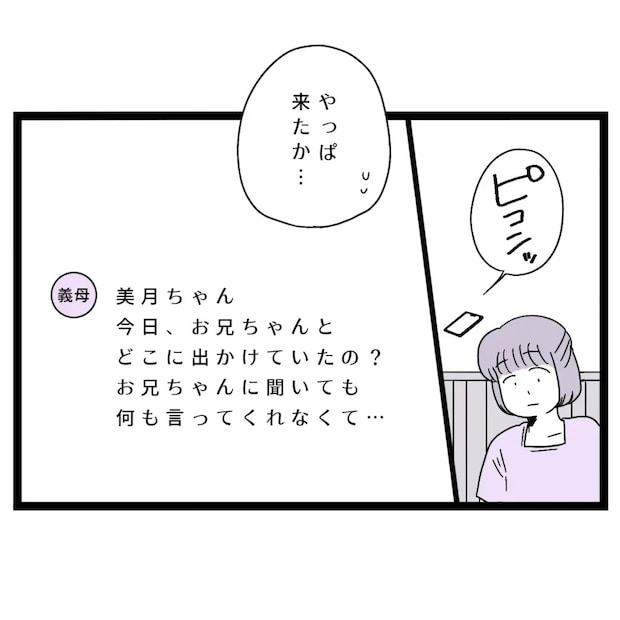 帰宅した私に、義母から「美月ちゃん、今日、お兄ちゃんとどこに出かけていたの?お兄ちゃんに聞いても何も言ってくれなくて・・」とメッセージが届きました。「やっぱ来たか・・」とこれは想定内。