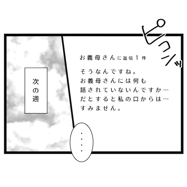 私は「そうなんですね。お義母さんには何も話されていないんですか・・。だとすると私の口からは・・すみません」と含みを持たせて返信。そして次の週末。
