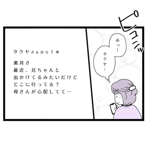 しばらくすると、タクヤからメッセージが届きました。「美月さ、最近、兄ちゃんと出かけてるみたいだけど、どこに行ってる?母さんが心配してて・・」