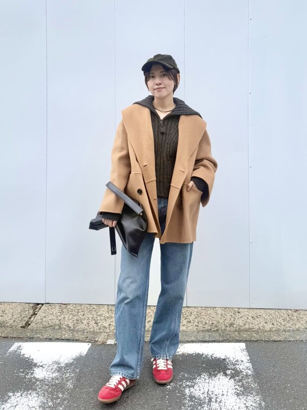 コーデュロイのキャップをプラスすることで、スポーティ過ぎない大人のカジュアルスタイルに。ビターなカーキ色を選ぶのも、子どもっぽくならないポイントです。