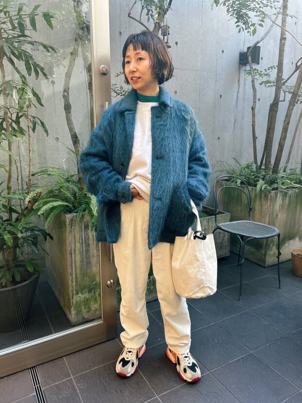 一見ラフなスタイリングですが、コーデュロイのパンツやシャギーコートの素材感でグッと洒落た雰囲気に。ダークトーンになりがちな秋冬ですが、ホワイトを取り入れるとコーデが華やかに決まります。