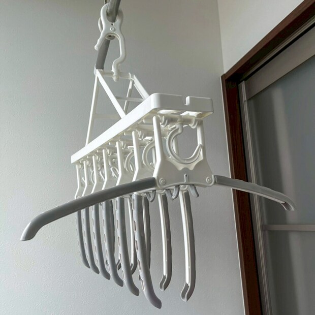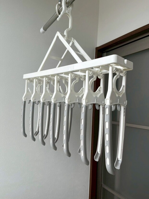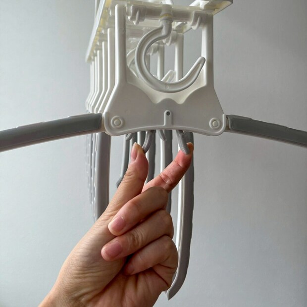 首周りが詰まったハイネックや丸首などのトップスも、普段のやり方より3倍は確実に速く完成。何なら、衣類を取り入れる時は、中央の突起をつまめば、アームが閉じて服が簡単に外れるので、トータル5倍速以上は効率的になっています!