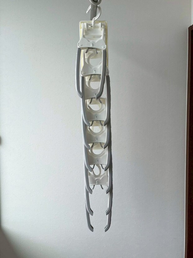 また、使用しない時、もしくは省スペースで収納したい時は、縦収納が出来る設計になっています。急な来客が決まり、急いで部屋干しを片付けなくては!!!という山陰あるあるシーンに遭遇しても、縦収納へ変えちゃえばクローゼットへ省スペースで隠すことが出来るな…と思いました。(笑)
