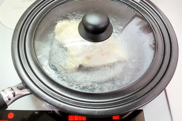 中火に点火して2分ほどすると水分がふつふつとし、フライパン内に蒸気が溜まりました。