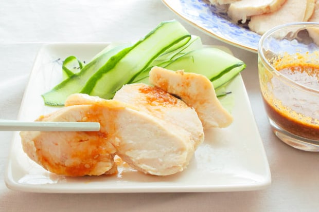 コールドスタートで蒸した「フライパンよだれ鶏」がこちら。蒸した鶏むね肉を7mmほどにスライスしましたが、しっとりとやわらかく、淡い桜色に仕上がりました。