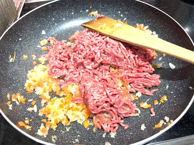 2. 熱したフライパンにオリーブオイルを入れて、1の玉ねぎ、にんじん、にんにくを中火で炒める。野菜から少し水分が出てししんなりしてきたら、合いびき肉を加えて肉の色が変わるまで丁寧に炒める。