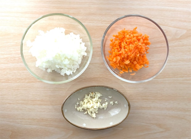 1. 玉ねぎ、にんじん、にんにくは、それぞれ皮を剥いてからみじん切りにする。