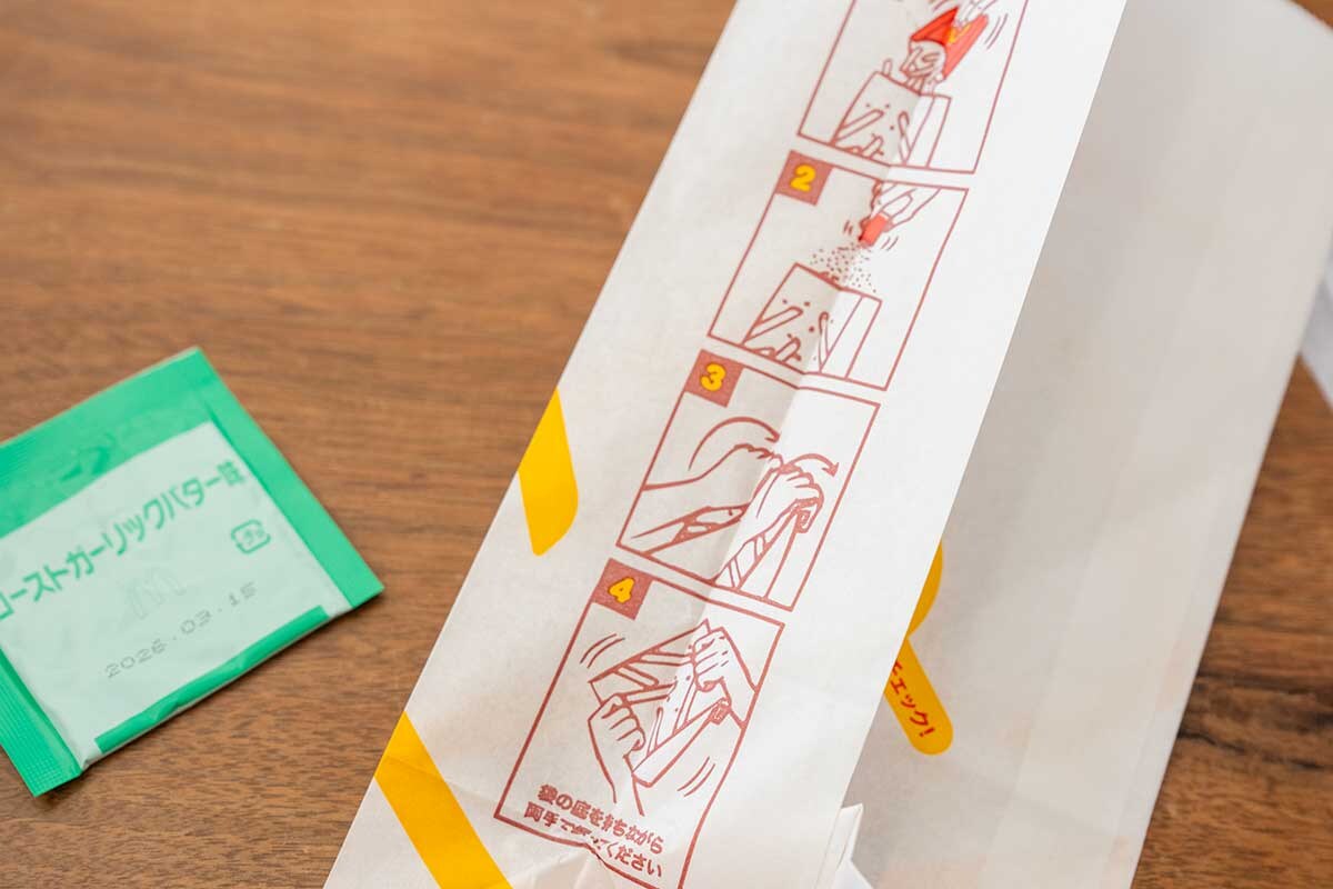 専用の紙袋の側面には、「シャカシャカポテト」の楽しみ方が描かれています。