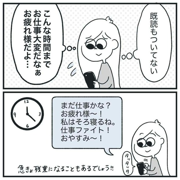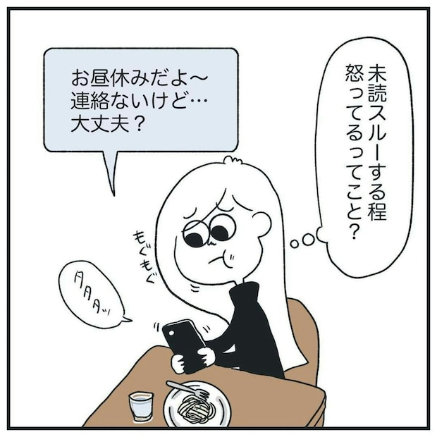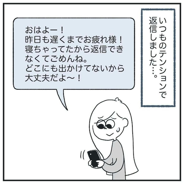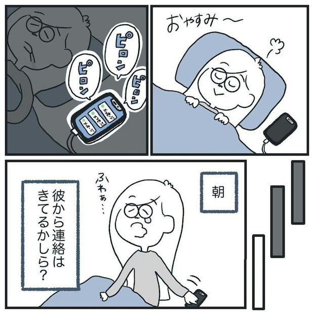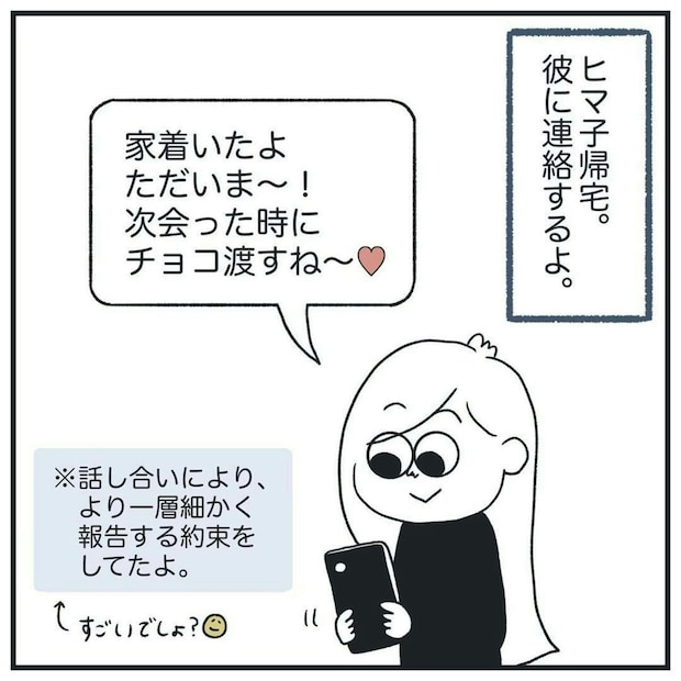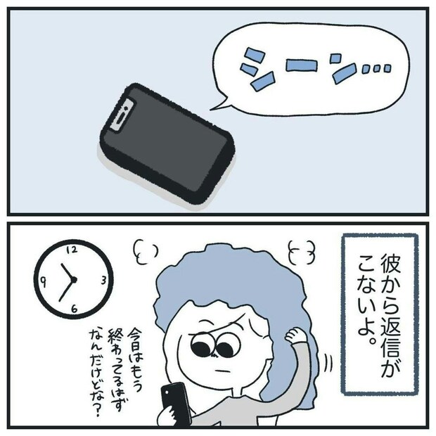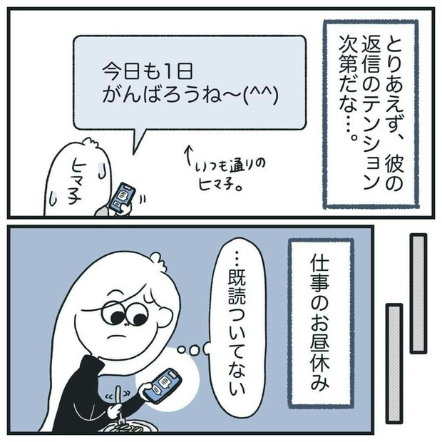疑い深い彼氏のために、マメに連絡をするヒマ子さん。涙ぐましい努力ですね…。ところが、彼氏からは一向に返事がきません。