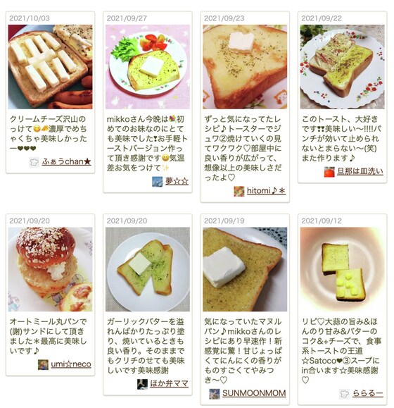 つくれぽ(作りましたフォトレポートのこと)にも「切れ目を入れた食パンにガーリックソースが染み込んであまじょっぱさが最高においしかったです」「パンチが効いて止められないとまらない~(笑)」「噛んだ瞬間ジュワ〜っと広がる甘じょっぱさとにんにくの香りが堪らない」などのコメントが寄せられており、ハマる人が続出している模様。