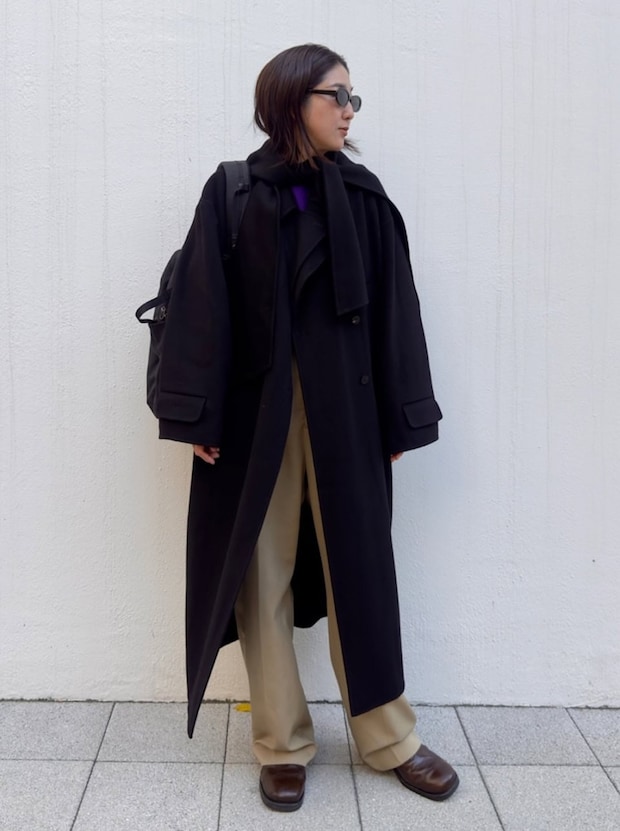 「キレイなブラックのコートが欲しくてずっと探していたのですが、今季デビューしたOHROHEEでついに出会った1枚を主役に。クラシカルな雰囲気のロングコートなので合わせはカジュアルにスタイリングしました。中に着たトップスはi AWAKのリメイクスエットで、ボタンでシルエットが変えられるところがお気に入り。オーソドックスな形のスエットだとオフ感が出てしまいますが、これはおしゃれさもキープできて◎」