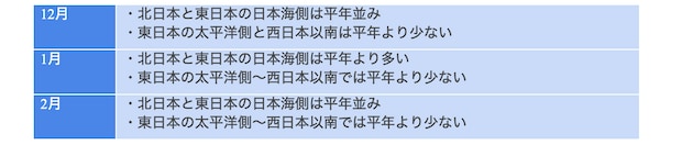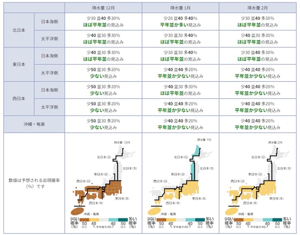 以下は気象庁が2025年11月25日に発表した3か月予報をもとに、12月~2月の降水の特徴をまとめています。