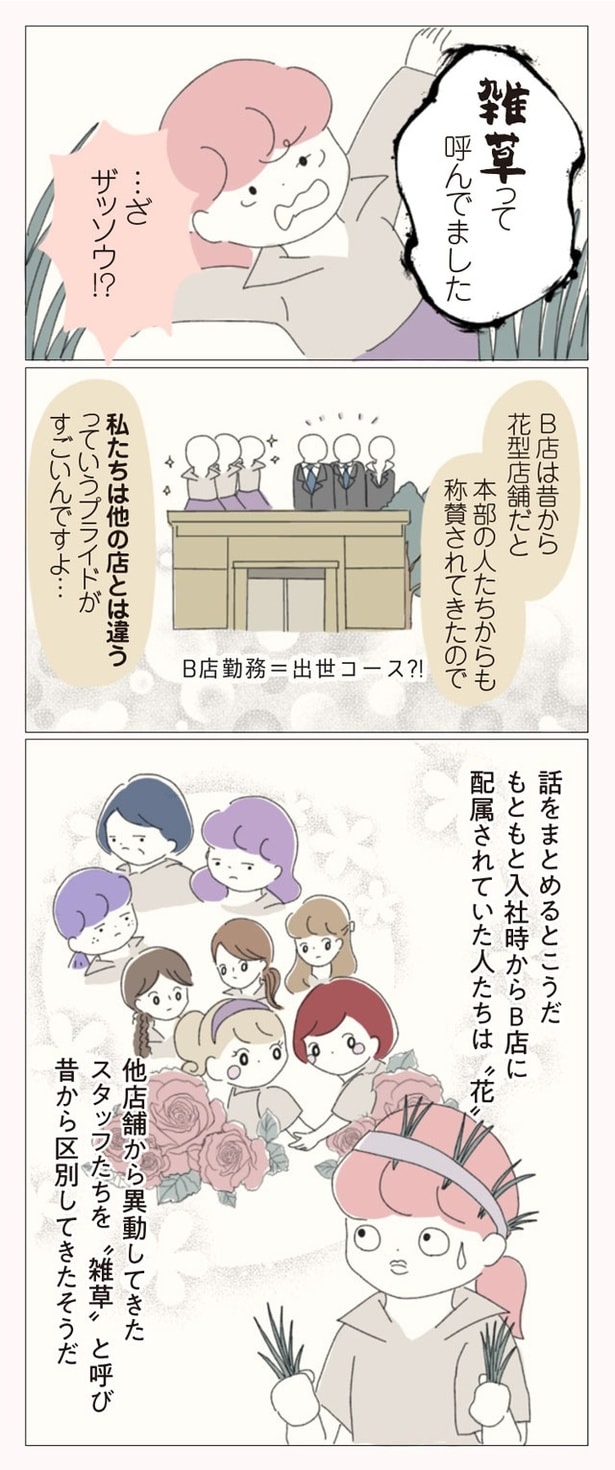 子ども服ブランドでショップ店員をしているぼのこは、数ある店舗の中でも花形のB店へ異動が決まった。B店は花形と言われる一方で、昔からの派閥争いが有名。新人や異動してきたスタッフがすぐに退職してしまうという疑惑があるのだった。緊張の中、異動初日を迎えたぼのこは、早速、店長やスタッフたちから理不尽な思いを受ける。ねちねちマウンティングや悪口に陰口、過剰な先輩優先システムなど…。やがて心身ともに疲弊したぼのこは、この店舗に誰一人味方がいないことを確信。お店の悪しき風習を断ち、スタッフたちに「復讐」するため、ぼのこは店長を目指すことを決意するのだった――。