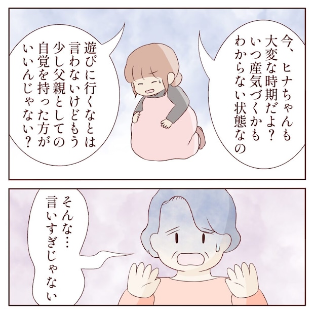 「ヒナちゃんはいつ産気づくかもわからない状態なの、もう少し父親としての自覚を持った方がいいんじゃない?」普段は言葉を選ぶカナコさんも、今回ばかりは見過ごせなかったようで、珍しくストレートにリクさんへ物申します。その強い口調に、義祖母は「そんな・・・言いすぎじゃない」と小さく声をもらしました。