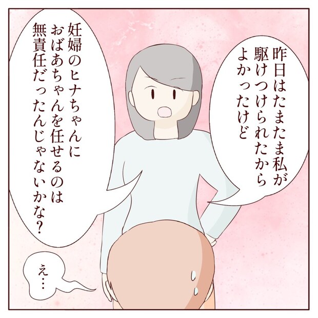 「昨日はたまたま私が駆けつけられたからよかったけど、妊婦さんにおばあちゃんを任せるのは無責任だったんじゃない?」カナコさんがそう言うと、リクさんの顔はみるみる青ざめていきます。