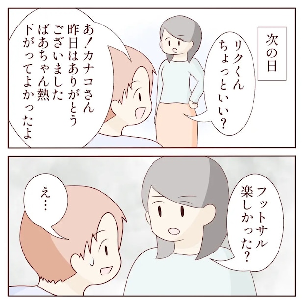 次の日、熱が下がったと聞いて、義祖母の家にやってきたリクさん。もう本調子ならいつも通りお世話をしてもらおうと家にあがると、「リクくん、ちょっといい?」とカナコさんに呼び止められました。「あ!カナコさん昨日はありがとうございました、ばあちゃん熱下がってよかったよ」昨日のことを悪びれる様子はありません。するとカナコさんが冷めた表情で「フットサル楽しかった?」と問いかけました。