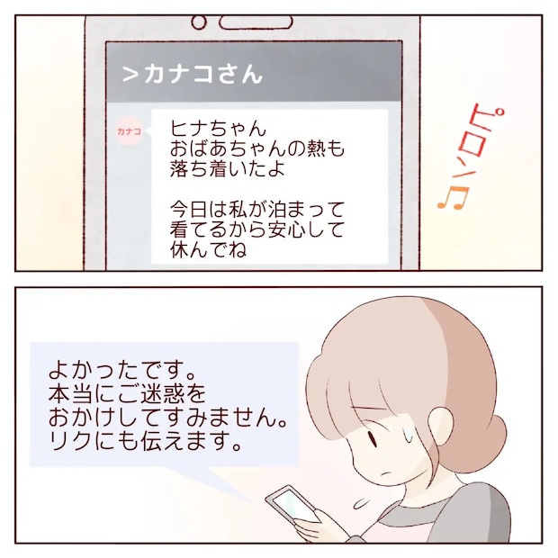 すると、ヒナさんのスマホにカナコさんからメッセージが。義祖母の熱が落ち着いたことと、今日は泊まって看てるから安心して、という内容でした。ヒナさんは申し訳なさでいっぱいになりながら「本当にご迷惑をおかけしてすみません」と返信しました。
