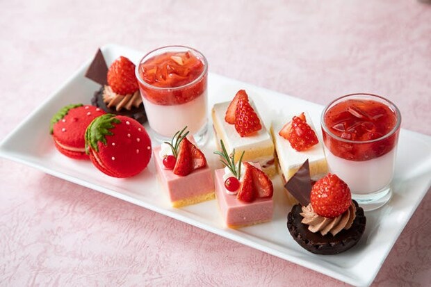注目のスイーツには、定番人気の「苺のショートケーキ」をはじめ、いちごのフォルムが愛らしい「苺のマカロン」や、いちごのコンフィチュールが決め手の「苺のパンナコッタ」、相性抜群の組み合わせが楽しめる「苺とチョコレートのタルト」、ピンク色がかわいい「苺のレアチーズ」などの5品が用意される。