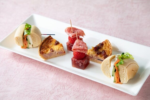 セイボリーには、食べ応えのある「サーモンとクリームチーズのパニーニ」や、意外な組み合わせが楽しめる「ドライストロベリーとハム・チーズのキッシュ」、甘みと塩気のバランスが絶妙な「苺のゼリーとサラミのピンチョス」などの3品がラインナップ。