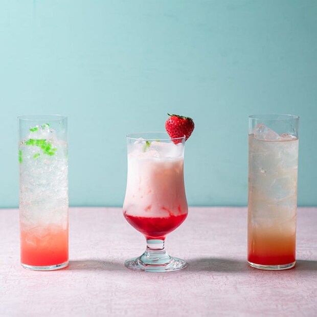 オプションドリンクには、いちごの香りがふわりと広がる乾杯におすすめのモクテル(ノンアルコールカクテル)2種類と、飲みやすいウォッカベースカクテル1種を用意。