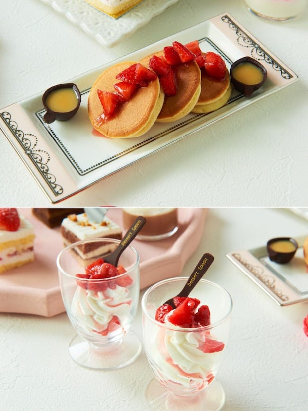 その場で焼きあげるふわふわの「いちごのパンケーキ ショコラカップのハチミツ添え」も必見。いちごの食感が楽しい食べるソースと、チョコレートのカップに入ったはちみつをたっぷりとかけて味わおう。