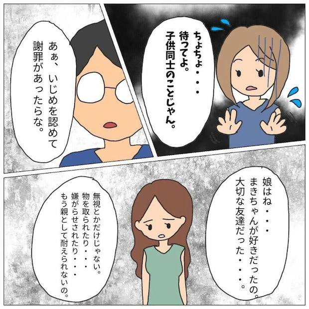 娘がいじめた相手の両親の前で、こんな言い争いをするなんて…。当事者なら耐えられない光景です。