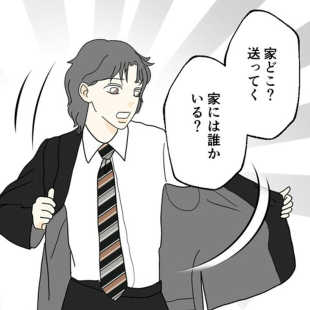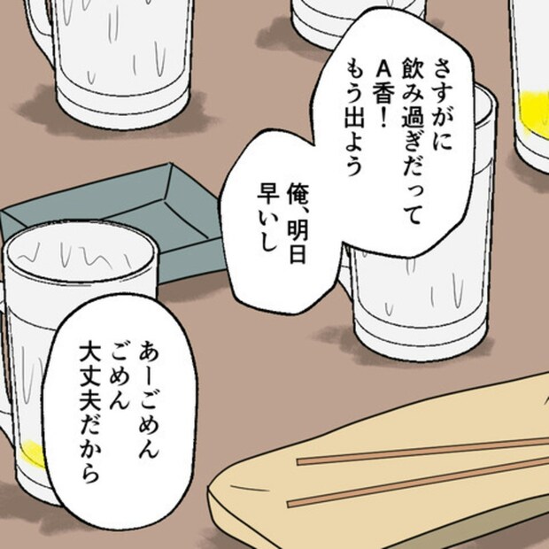 A香さんはE原さんに会えてうれしかったといいました。飲み過ぎているA香さんを心配して、E原さんは家に送っていくといいます。