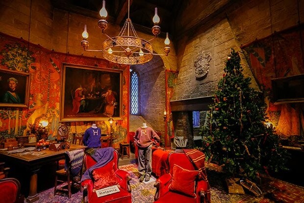 ハリーたちが学生生活を送ったグリフィンドールの男子寮と談話室にも、ツリーが登場。クリスマスならではの温もりを感じられる空間に。