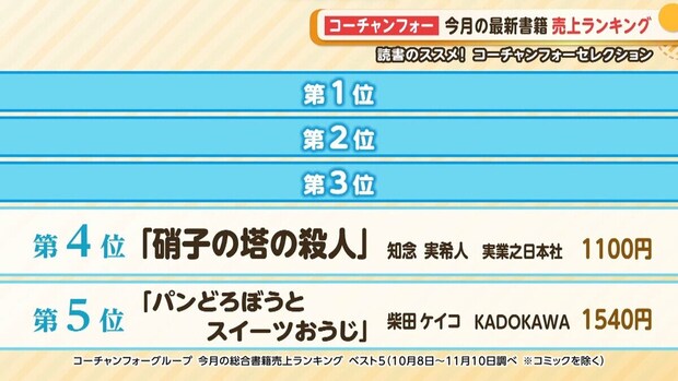 大野アナ:続いては「読書のススメ!コーチャンフォーセレクション」です。道内8店舗、関東で2店舗を展開するコーチャンフォーの、書籍売上ランキングベスト5をご紹介します。