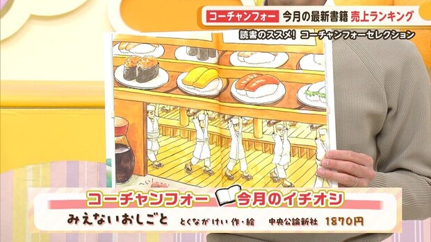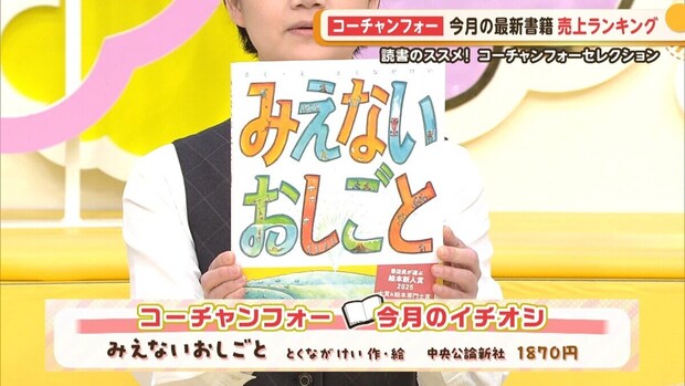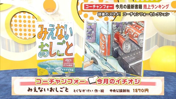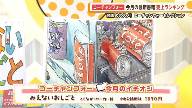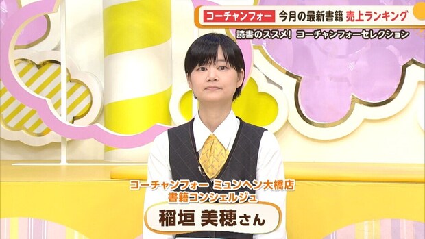 大野アナ:コーチャンフォー今月の書籍売上ランキングはご覧の通りです。今回、初めてランクインしたものが多くなってますね!ではここで、コ―チャンフォーミュンヘン大橋店の稲垣さんに、今月のイチオシ本をご紹介いただきます。