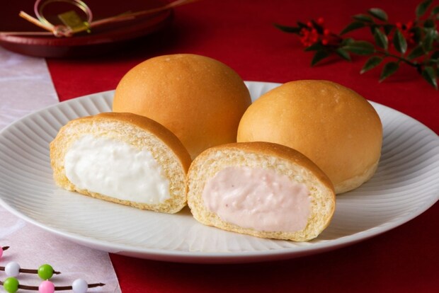 新年の門出をお祝いする、紅白のクリームが入ったくりーむパン。『紅』はあまおう苺の甘味とほど良い酸味を味わえる「くりーむパン いちご」、『白』は北海道産生乳100%の牛乳で作った特製ミルククリームを入れた優しい甘さの「くりーむパン みるく」で表現した。