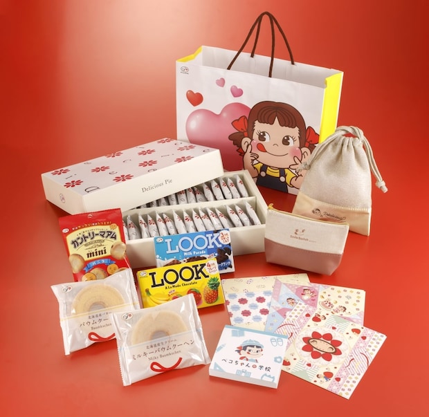 福袋には、ポーチやメモ帳などのペコちゃんグッズに加え、不二家の人気菓子(デリシャスパイ、バウムクーヘン、ルック、カントリーマアムミニ〈バニラ〉)がセットとなっている。