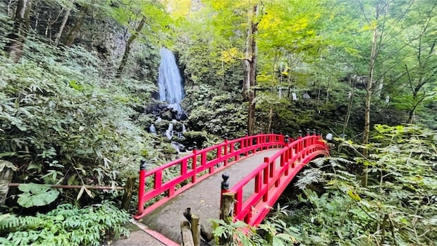 四季館 彩冬から車で約15分、不動の滝駐車場に到着。駐車場から歩いて5〜10分ほどで滝にたどり着きます。滝に近づくとマイナスイオンたっぷりのひんやりした空気で、心も体もリセットされるような感覚でした。滝は迫力もあり、季節ごとに違う表情を楽しめるスポットです。