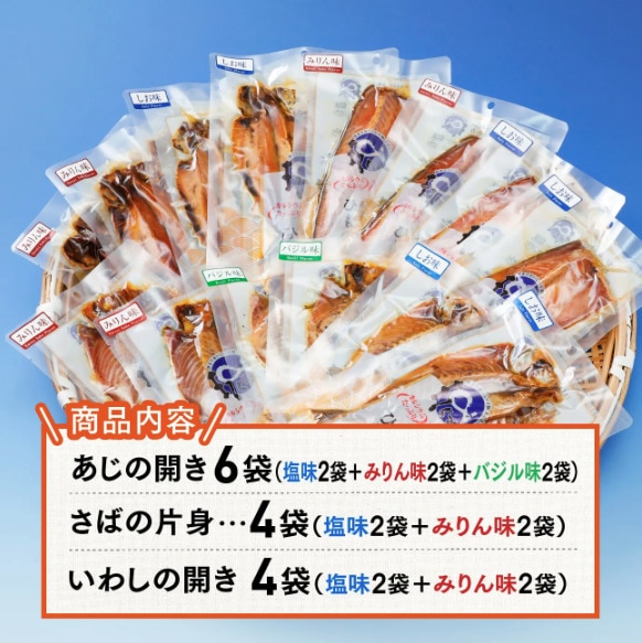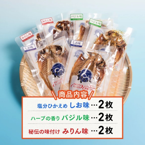 今回ご紹介する【6枚入りセット】は、あじの開き「しお味」「バジル味」「みりん味」2枚ずつバランスよく詰め合わせた、合計6枚入りセットです。3種類の味が食卓のバリエーションを豊かにしてくれます。忙しい日のもう一品や、カルシウム補給にも最適です。