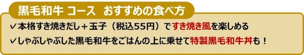 口の中でとろけるような食感が楽しめる「黒毛和牛」食べ放題も実施。シニアは550円引き、小学生は1,099円、幼児無料。