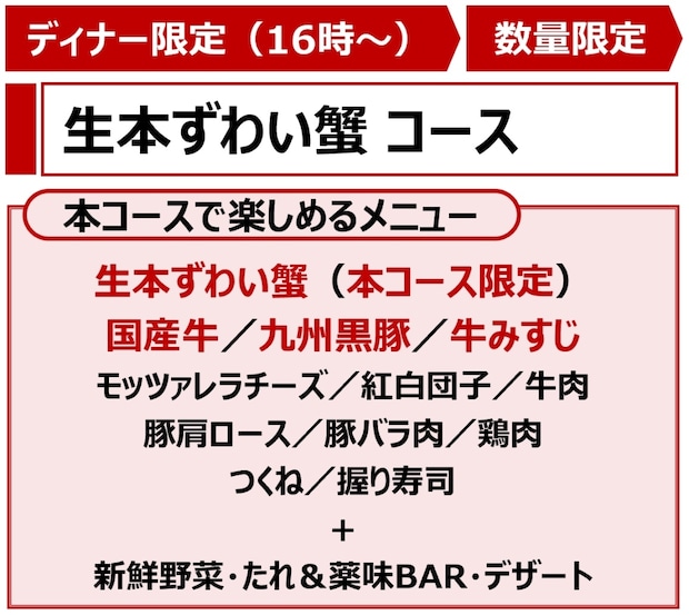 2024年の約2倍の600万本を用意。生本ずわい蟹の脚のみを贅沢に味わえる本コースだが、今年は「国産牛・九州黒豚」も食べ放題に含まれているという。シニアは1100円引き、小学生は大人の半額・幼児は無料だという。