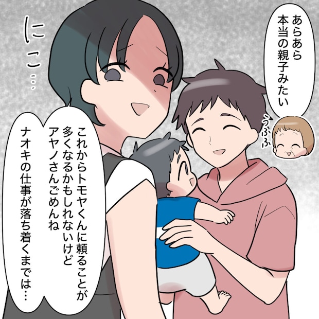 ソウくんを抱っこしたトモヤの隣にキョウカさんが並ぶと、「あらあら、本当の親子みたい」と笑顔で言う義母。すると、「これからトモヤくんに頼ることが多くなるかもしれないけど、アヤノさんごめんね。ナオキの仕事が落ち着くまでは・・」そう話すキョウカさんの、何か含みがあるような笑顔が少し気になりました。