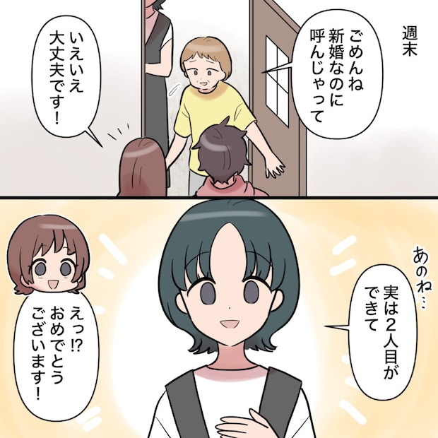 「ごめんね。新婚なのに呼んじゃって」と謝る義母に「いえいえ大丈夫です!」と答える私。するとキョウカさんに「あのね・・実は2人目ができて」と言われ「えっ!?おめでとうございます!」と心からお祝いの言葉を伝えました。