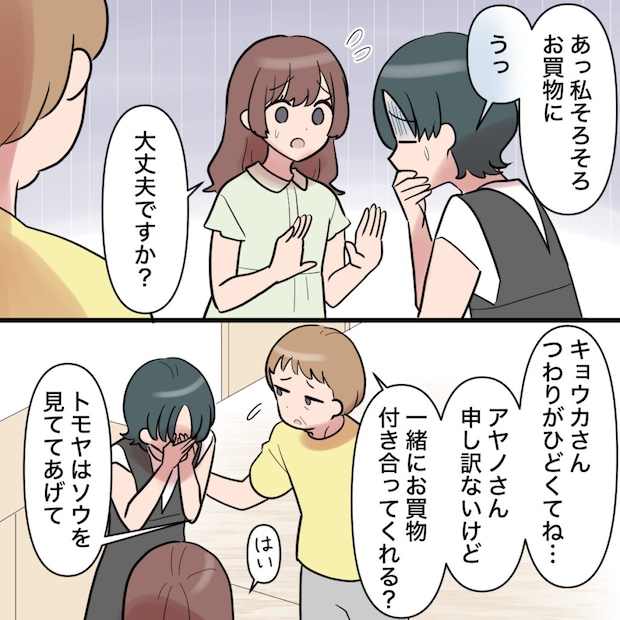 そして、「あっ私そろそろお買い物に・・うっ」キョウカさんはそう言いながらも気分がすぐれない様子。「大丈夫ですか?」と声をかけると、「キョウカさん、つわりがひどくてね・・アヤノさん、申し訳ないけど一緒にお買い物付き合ってくれる?」義母にそう言われ「はい」と返事をすると、「トモヤはソウを見ててあげて」義母がトモヤに声をかけました。