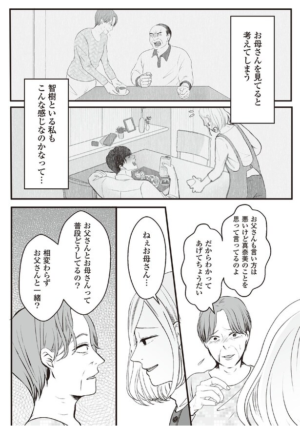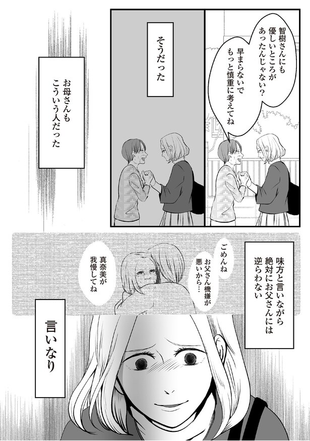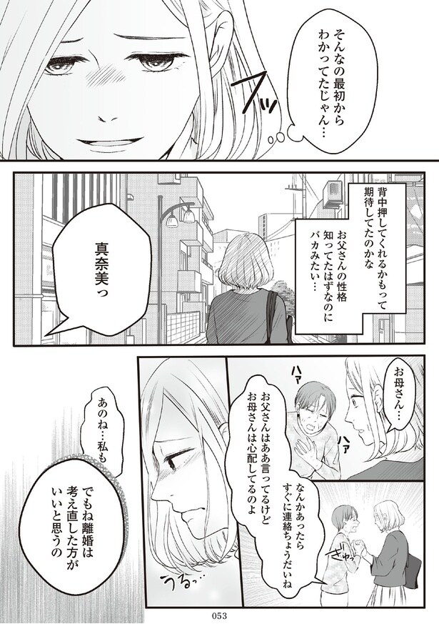 前回、実家に帰り両親に離婚の相談をするも、猛反対をされてしまった真奈美。優しいけれど、父の言いなりになる母の姿に、真奈美は自分を重ねてしまい…。