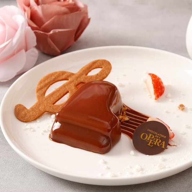 プティ・ガトーには、ホワイトチョコレートムースといちごが閉じ込められたライチジュレのヴェリーヌ「プレリュード・ブラン」、ローズが香るいちごのレアチーズケーキ「ローズ・アダージョ」、ハート型のショコラサブレサンド「カルメン」、いちごのフィナンシェをチョコレートにディップし、宝石のように仕上げられた「ビジュー・ド・オペラ」、指揮棒をイメージした香ばしいヘーゼルナッツを楽しめるジャンドゥーヤバー「バトン・デュ・マエストロ」の5種をラインナップ。
