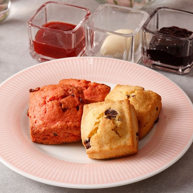 焼きたてのスコーンは、ストロベリーとチョコレートの2種類を用意。お好みで、クロテッドクリームやストロベリージャム、ブルーベリージャムを付けて召し上がれ。