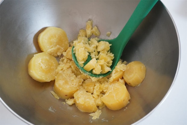 ボウルに移して熱いうちにマッシャーなどでつぶします。