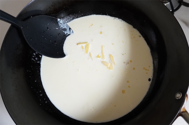 5. フライパンに生クリームを入れて沸騰させ、ピザ用チーズ、おろしにんにく、塩(2つまみ)を加えて、とろみがつくまで煮立てる。