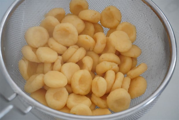 4. 3のニョッキを塩(適量)を加えた熱湯(分量外)で茹でる。浮き上がってきたら、約40秒くらい茹でて、ザルに上げて水気を切る。