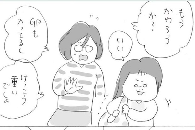 買い物帰りに、重い荷物を持ちたがる娘。人目が気になる母は「ひどいお母さんだと思われちゃうから、持たなくていい」と言いましたが、娘は…という内容で、読者からは「すてきな考え方」「励まされました」などの声が上がっています。