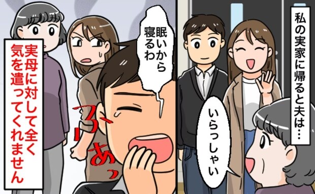 家族で実家に帰省する度に、夫がまるで自分の家で過ごしているかのような態度に疑問を感じている投稿者さん。自分が義実家に行ったときと比べると、あまりにもリラックスしている様子の夫にモヤモヤするとのこと。