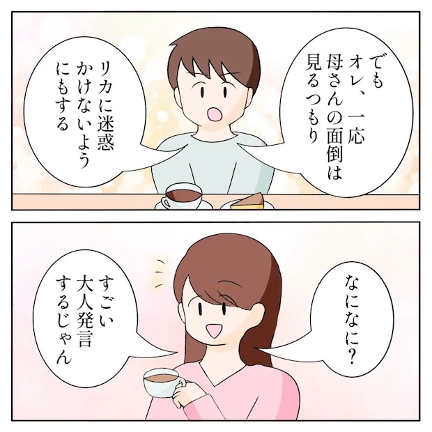 誰も連絡を取らず、実家にも行かなくなってしまって寂しい母のことを可哀想だと言った私ですが、シュウトは「自業自得」と言いました。「でもオレ、一応母さんの面倒は見るつもり。」とシュウトはきっぱり宣言しました。弟が誇らしく思えて「すごい大人発言するじゃん」と言いました。