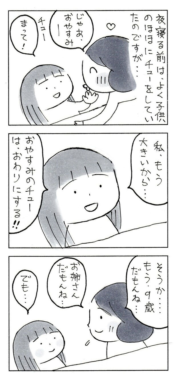 なりたりえさんは、寝る前には必ず娘さんのほっぺに チューをしていたそうです。しかしある夜、いつものように「おやすみ」と言ってチューしようとしたところ…。
